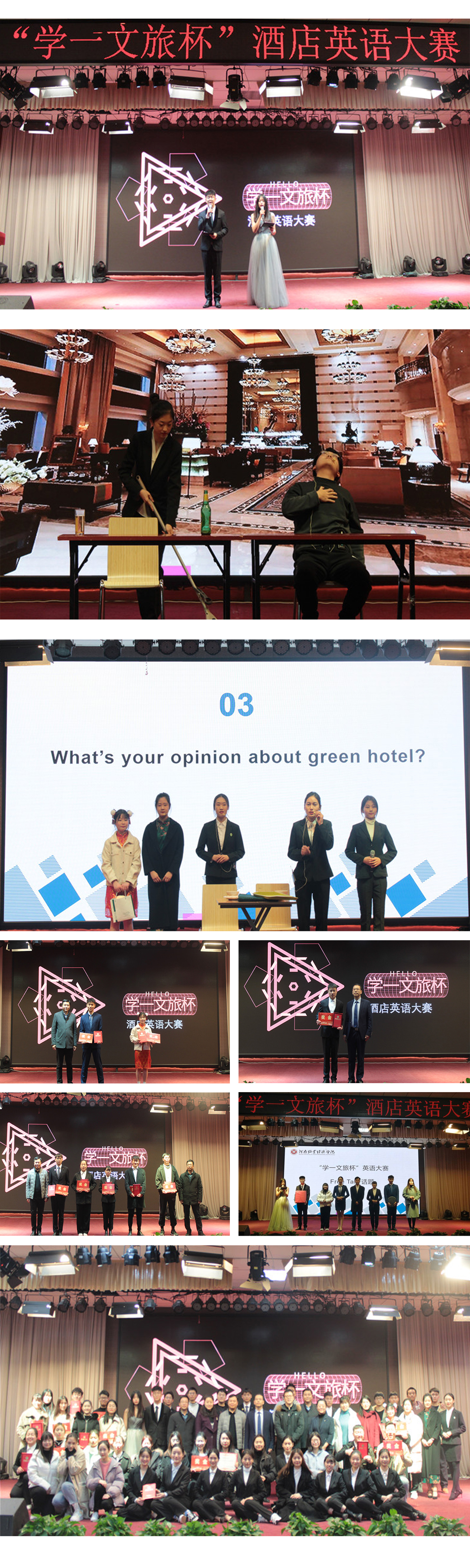 此次活动分决赛和初赛两部分,共计十个队伍进入决赛。比赛内容由自选主题情景剧和Free Talk话题两部分组成。在我院文艺部优美的舞姿中,比赛拉开帷幕。各小组紧紧围绕酒店的前厅、餐饮、客房三个部门进行情景剧表演。其中,第八小组表演的酒店工作人员向顾客介绍了中国美食和景点的情景,以精确的演绎、动人的剧情得到了评委和观众们的一致好评。第三小组以酒店前厅接待和吧台服务为背景,用流利的英文对话再现了如何与客人进行高效的交流与互动,让观众们身临其境地体会酒店服务的情形。经过激烈的比赛角逐和评委的认真评选,最终第八组获得一等奖,第四组、第十组获得二等奖,其余小组获得三等奖。副院长王中雨对比赛做出了精彩点评。他指出,语言学习最重要的就是要学会运用和表达,希望同学们积极参加此类活动和竞赛,在比赛中学习、在与他人的对话中逐步提高口语水平。至此,本次英语情景大赛圆满结束。