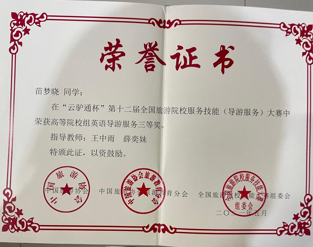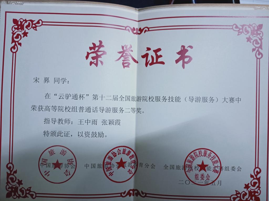 5月16日,“云驴通杯”第十二届全国旅游院校服务技能(导游服务)大赛在青岛酒店管理职业技术学校落下帷幕。我院派出3名参赛选手参加了高校普通话组和英语组的比赛。经过四天紧张而激烈的角逐,我院参赛选手成绩喜人,其中:宋奡获高校(普通话组)二等奖、刘梦云(普通话组)和苗梦晓(英语组)获三等奖的好成绩。