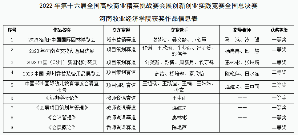 11月26日至28日,由中国国际贸易促进委员会商业行业委员会、中国国际商会商业行业商会、中国商业经济学会和中国会展经济研究会等共同主办的2022年第十六届全国高校商业精英挑战赛会展专业创新创业实践竞赛全国总决赛在线上成功举办。本次竞赛吸引了来自全国28个省、市、自治区和直辖市的466所高校近2600支队伍报名参加。经部分地区省赛、院校推荐选拔、组委会评审,最终有来自全国28个省、市、自治区306所高校1178支参赛队伍,6700多名参赛选手和辅导教师入围全国总决赛。在河南赛区省赛选拔基础上,我校推选的5支学生学生团队、4名教师经过文案评审、视频展示、线上答辩等环节均取得优异成绩,其中学生团队一等奖1项,二等奖4项;教师组一等奖3项,二等奖1项。我校同时获得优秀组织奖。