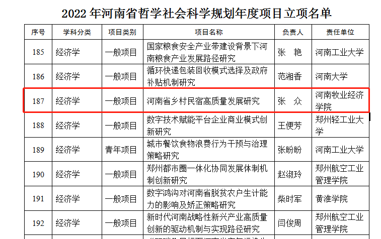 近日,河南省哲学社会科学规划办公室公布了2022年河南省哲学社会学科规划项目的立项名单。我院张众副教授的《河南省乡村民宿高质量发展问题研究》获准立项。该项目是我院“乡村民宿产业研究中心”成立以来,继《乡村振兴背景下的乡村民宿发展问题研究》(专著)获得2021年河南省社会科学优秀成果奖二等奖和河南省科技厅软科学重点项目《河南省乡村民宿发展模式研究》结项后的又一重要科研项目立项。
