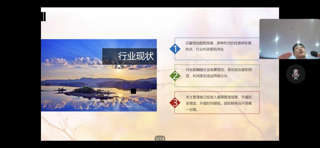 9月24日下午,受我院邀请,河南仟那酒店集团首席战略官、国家级民宿等级评定专家、河南省旅游协会饭店业分会副会长刘映今博士来我院为师生做一场“后疫情视角下酒店管理专业学生的职业发展路径”的专题讲座。讲座线上线下同步进行,我院酒店管理专业近300名师生参加了本次讲座。讲座由我院副院长陈道山主持。