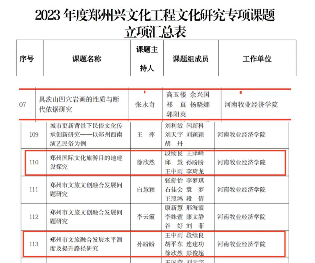 根据《关于申报2023年度郑州兴文化工程文化研究专项课题的通知》文件要求,我院科研办积极组织学院教师根据自身研究方向进行申报工作,并对有意向申报的老师一对一开展申报指南解读,最终张永奇、徐欣然、孙盼盼三名教师通过个人申报、科技处资料审核、专家评审等环节,喜获2023年度郑州兴文化工程文化研究专项课题立项。