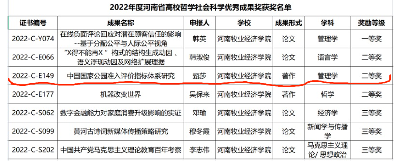 近日,河南省教育厅公布了2022年度河南省高等学校哲学社会科学研究成果奖评选结果,我院甄莎博士的《中国国家公园准入评价指标体系研究》著作荣获二等奖。《中国国家公园准入评价指标体系研究》是河南省新闻出版局2022年省部级重点立项项目,由郑州大学出版社出版。