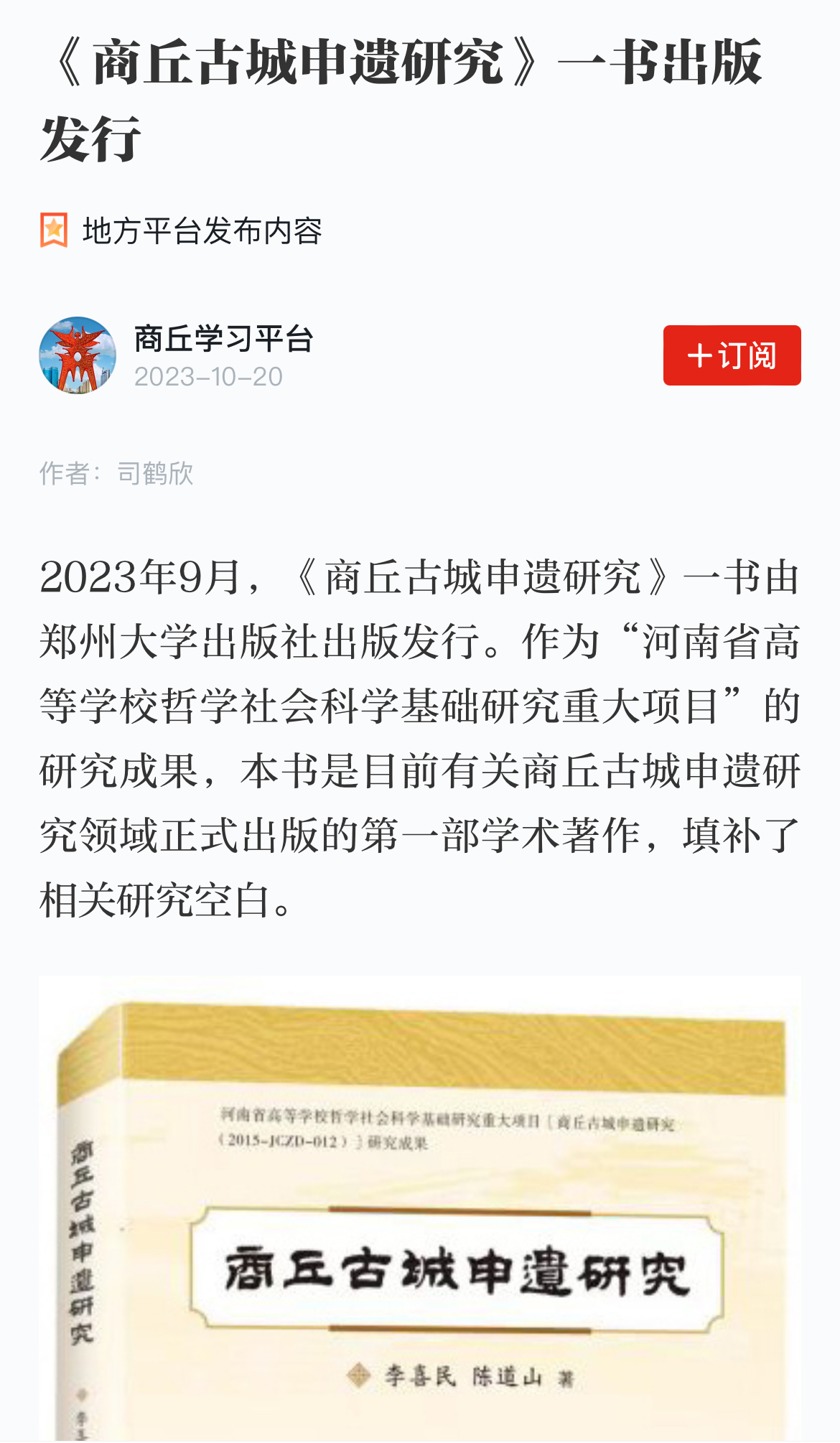 近日,学习强国平台刊发了《商丘古城申遗研究》一书出版发行的新闻报道(10月20日的《商丘日报》报道了《商丘古城申遗研究》一书出版发行的新闻)。