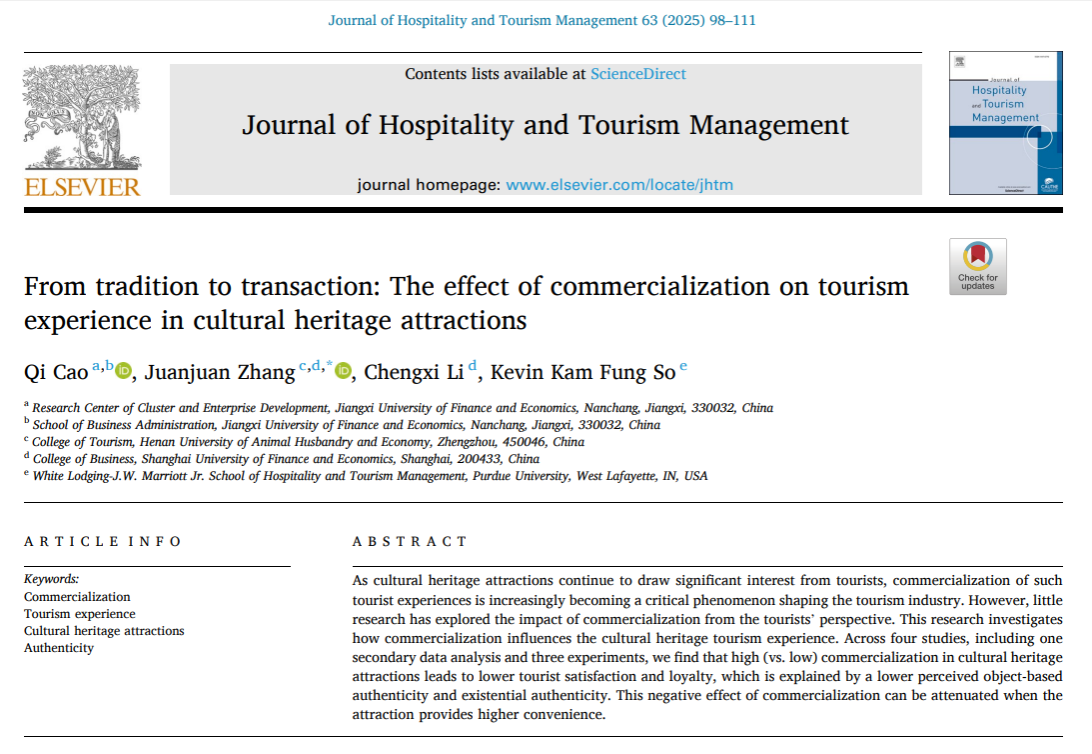 近日,我院张娟娟老师作为通讯作者的论文From tradition to transaction: The effect of commercialization on tourism experience in cultural heritage attractions(从传统到交易:商业化对文化遗产景区旅游体验的影响)在高水平期刊《Journal of Hospitality and Tourism Management》在线发表。