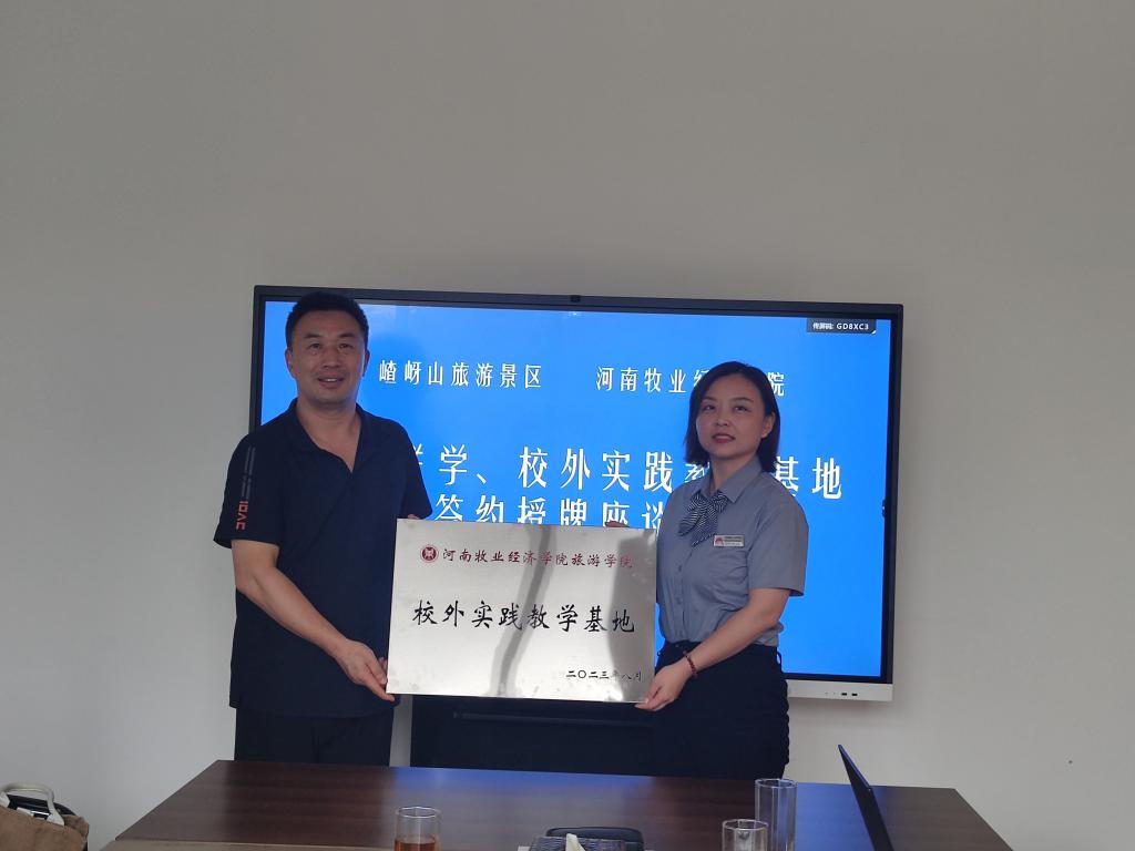 最后,权书记与王亚总经理签署了双方战略性合作协议。权书记代表学院授予嵖岈山景区为我院校外实践教学基地并授牌。