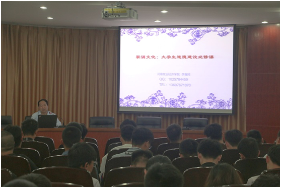 讲座上,李喜民教授围绕什么是家训文化、为什么要讲家训文化、怎样学习家训文化以及如何形成自己的家训文化四个方面,以生动幽默的语言风格、灵活多变的互动方式向大家进行了全面讲述。李教授指出家训文化是家训的物质载体、文化现象和社会影响,涉及物质生活和精神生活的诸多方面,是民族文化在家庭中的具体表现。他列举了身边出现的不道德现象和党内腐败现象,提出了倡导家训文化的缘由。他还告诉听讲师生在学习家训文化过程中,要学习家训文化源流和古代家训文化精华,剔除古代家训文化糟粕。最后,他结合当下社会现实,详细解读了朱子家训的主要内容。
