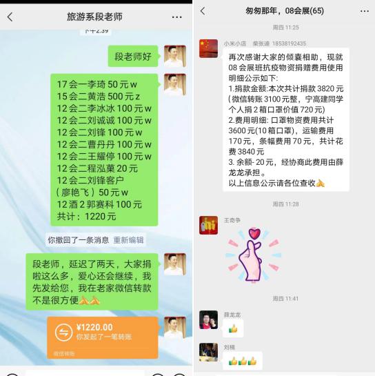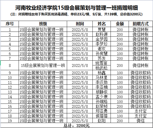 受疫情影响,两年多来,作为服务行业的会展业几乎按下了暂停键,专业校友也非常不容易,但他们心系母校、反哺情深,用实际行动自发为学校捐款捐物,彰显了williamhill英国中文会展专业校友的责任担当和高尚情怀。相信在全校师生的共同努力和广大校友的大力支持下,我校一定能取得疫情防控阻击战的全面胜利!(会展教研室供稿)