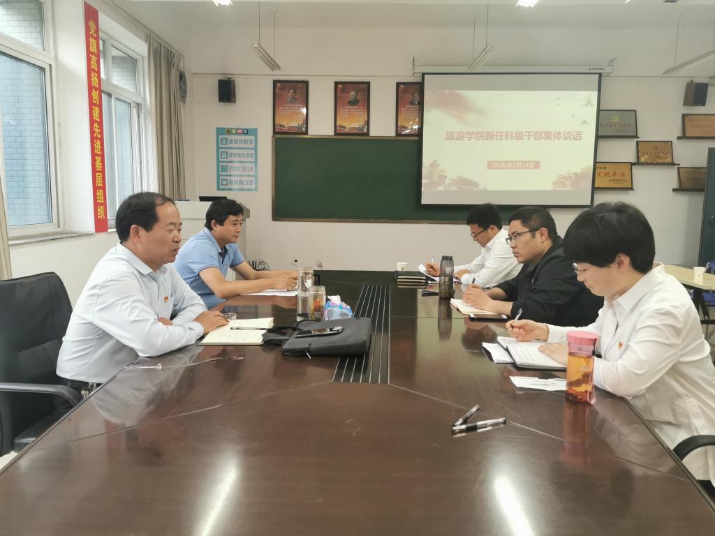 5月14日,旅游学院新任科级干部集体谈话会在二号教学楼C423会议室召开。学院党委书记李喜民、副书记陈明代表学院领导班子与三位新任科级干部进行了任职谈话。