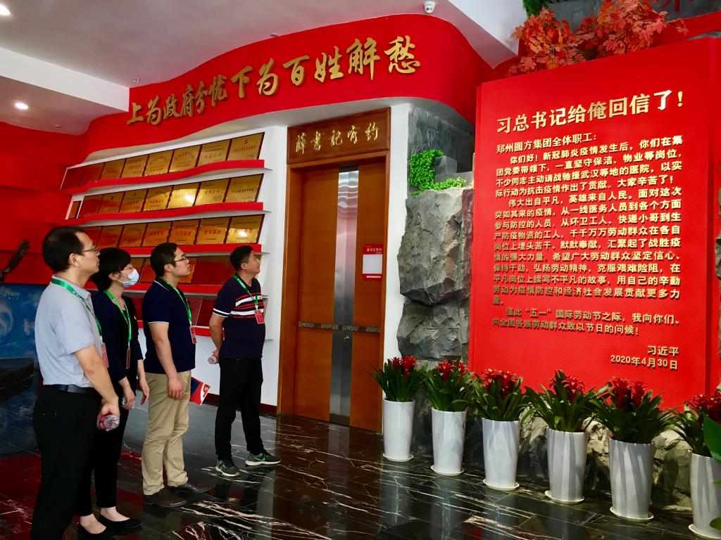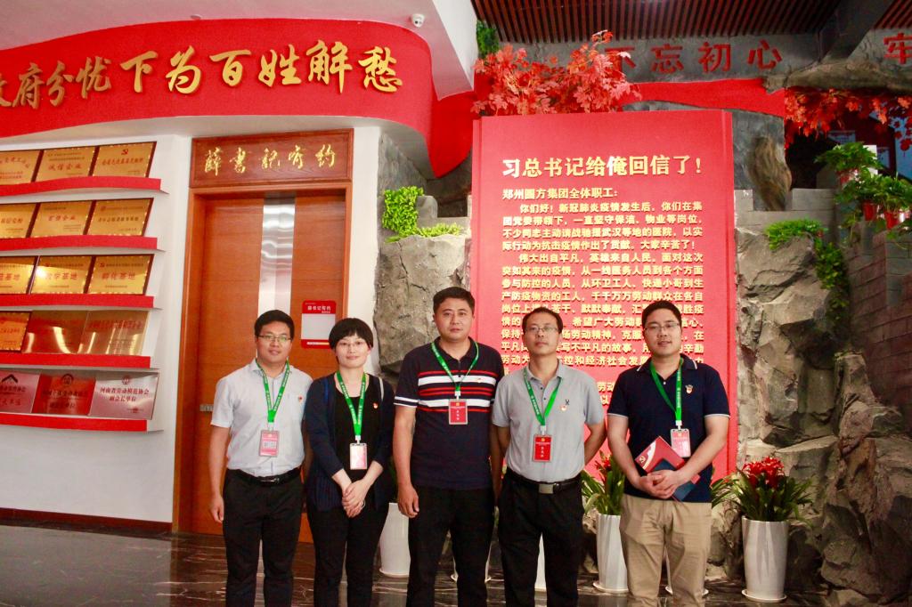“习近平总书记给俺回信了”,圆方集团党委书记薛荣一句朴实的话充分体现了总书记真挚深厚的为民情怀和人民至上的执政理念,体现了总书记和党中央对工人阶级和广大劳动群众的亲切关怀。为深入学习宣传贯彻习近平总书记给郑州圆方集团全体职工重要回信精神,同时按照校工会有关工作要求,2020年5月25日,williamhill英国中文组织部分党员干部赴郑州圆方集团参观学习。