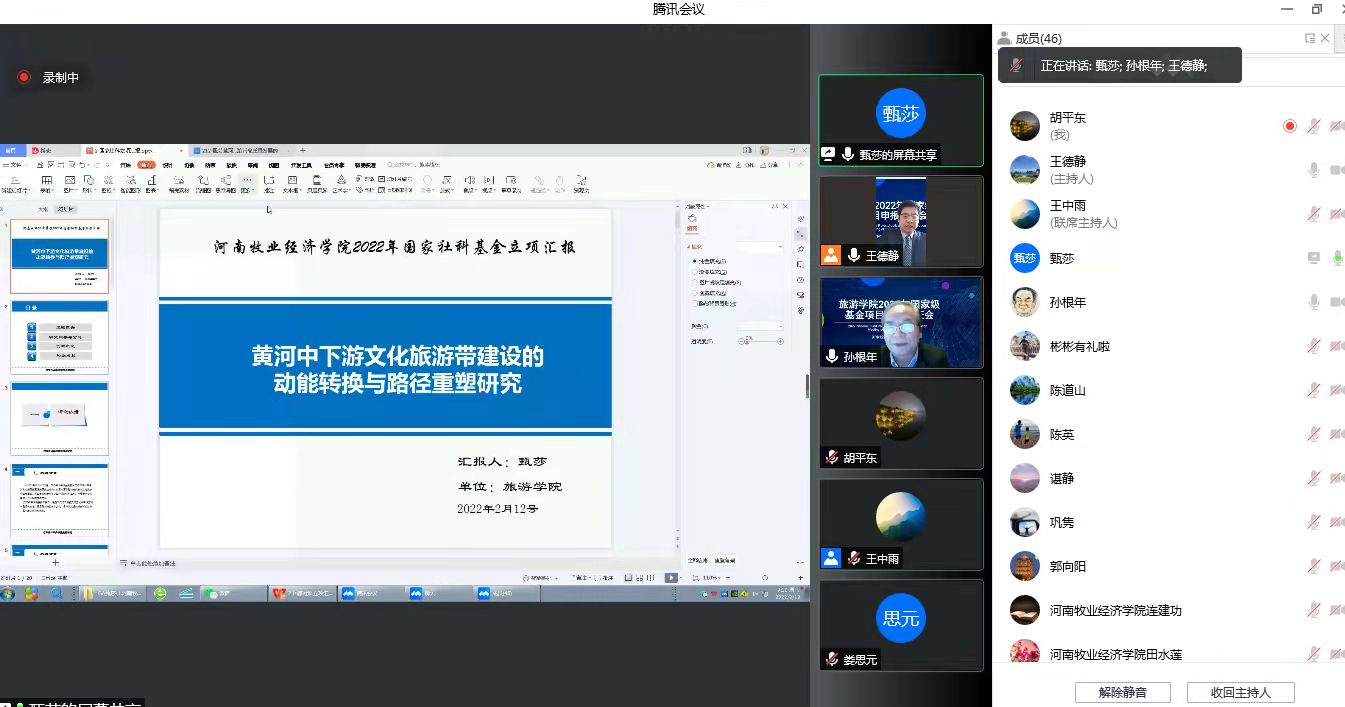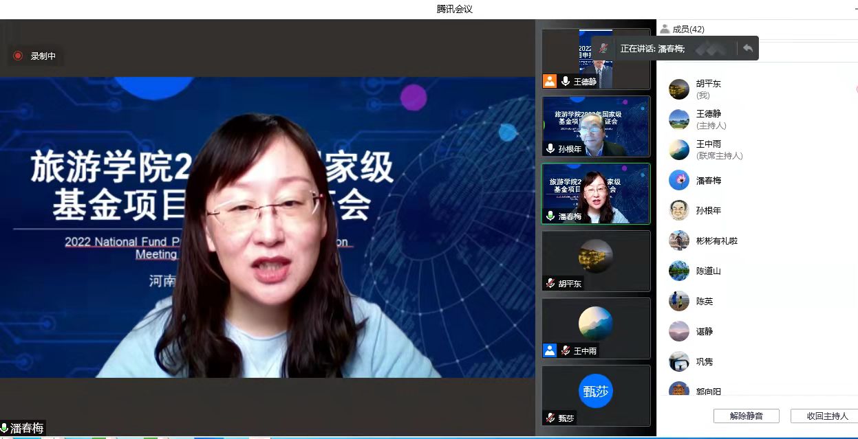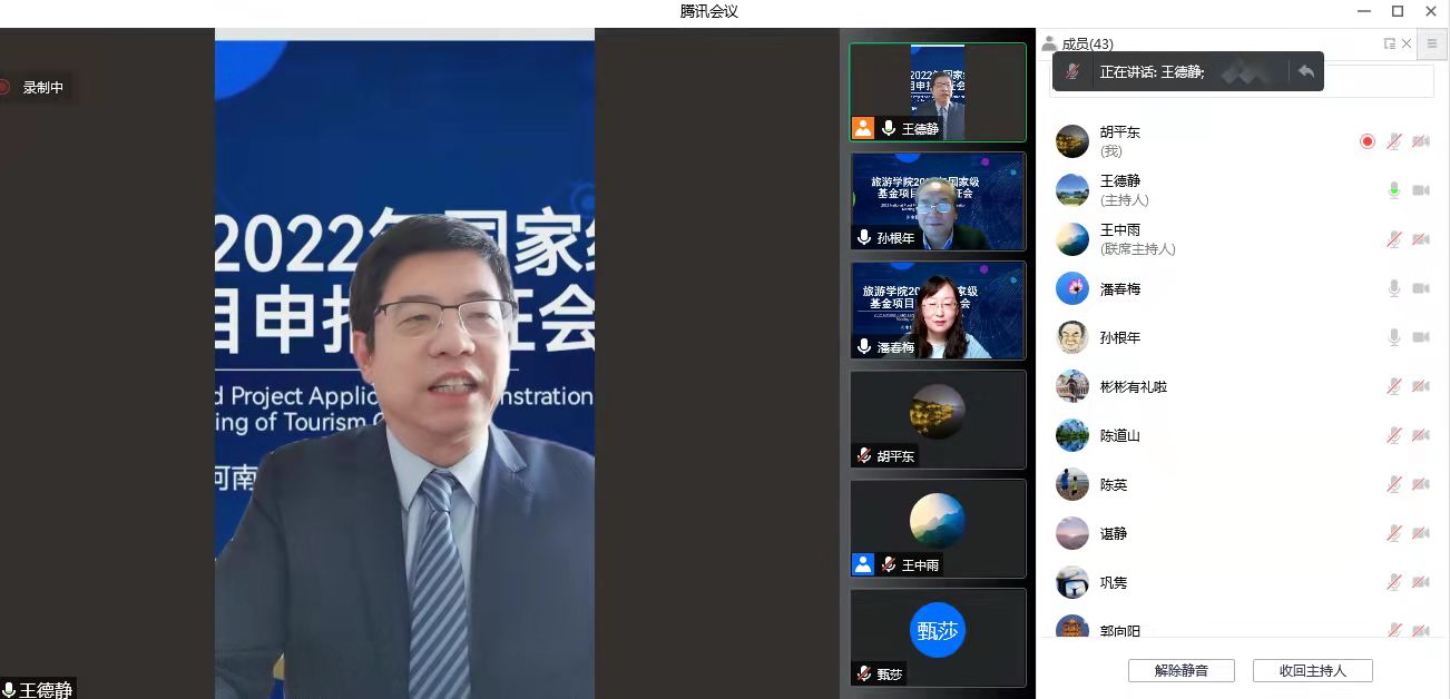2022年2月12上午旅游学院通过腾讯会议成功召开了2022年度国家基金项目申报论证会。本次论证会邀请到陕西师范大学旅游与地理科学学院旅游管理专业博士生导师孙根年教授担任评审专家。我校科学技术处处长潘春梅教授、副处长张红霞教授、社会科学管理科科长郭向阳老师所有老师出席了会议。会议由王德静院长主持。