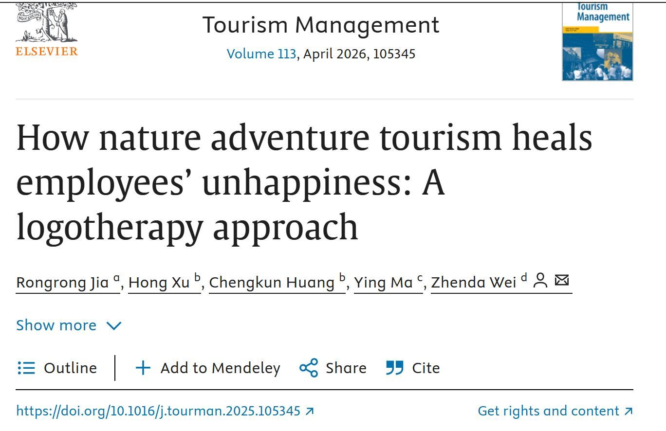 近日,旅游管理学科国际三大顶尖期刊之一的《Tourism Management》(影响因子IF=12.4, 引用指数CiteScore=26.5)接收并发表了我院贾榕榕老师作为第一作者、南开大学旅游与服务学院徐虹教授团队、聊城大学魏振达博士合作完成的研究成果《How nature adventure tourism heals employees’ unhappiness: A logotherapy approach》。