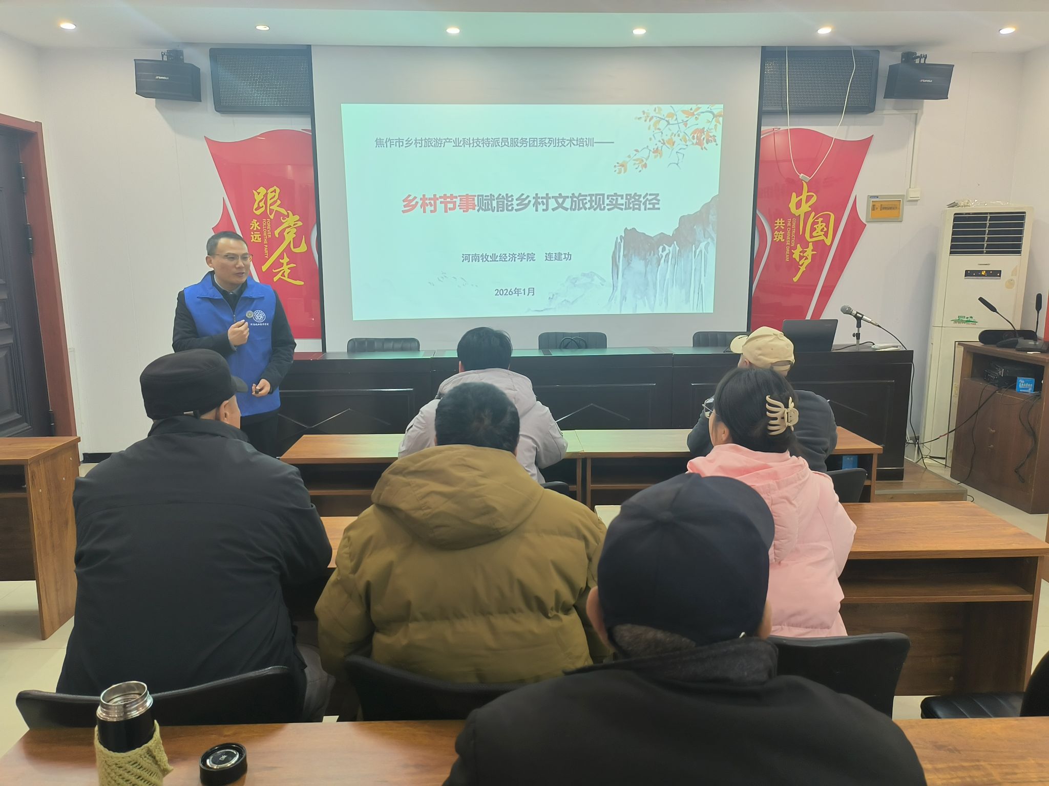 为深化乡村振兴战略实施,助力焦作市解放区乡村旅游产业高质量发展,1月28日下午,williamhill英国中文院长王中雨带领乡村旅游产业科技特派员服务团一行4人赴焦作市解放区开展专题技术培训。当地文旅从业者、基层干部及村民代表参加培训,现场反响热烈。
