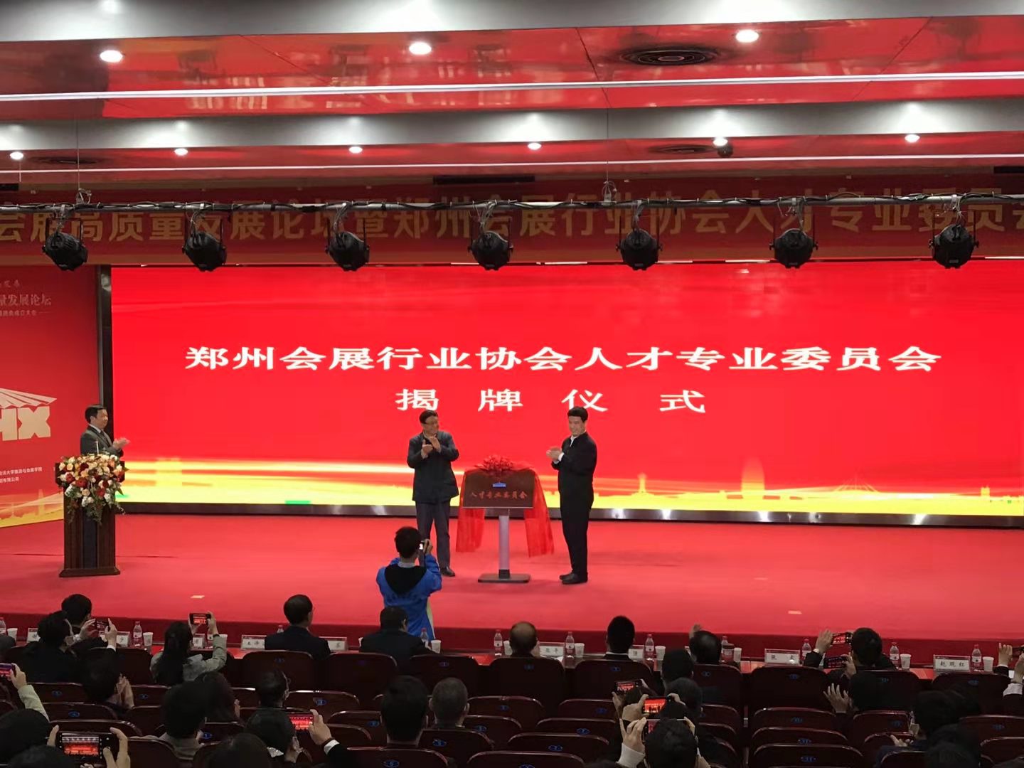 河南财经政法大学副校长刘荣增致欢迎词,河南省商务厅二级巡视员王苏、河南省政协经济委员会主任孙新雷、郑州会展行业协会常务副会长谢军、郑州会展行业促进中心副主任王亚平、郑州会展行业协会人才专委会主任赵现红先后致辞发言。大家一致认为人才对会展业发展的重要意义,郑州市会展行业协会人才专委会的成立为郑州乃至河南会展业人才建设提供了思路。大会为郑州会展行业协会人才专业委员会举行了揭牌仪式,williamhill英国中文当选人才专业委员会副主任单位。