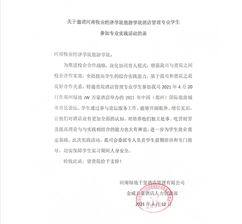 本次活动是学院受校企合作单位郑州绿地JW万豪酒店的邀请,根据校企合作和校外实践基地建设的实际需要开展的专项实训教学活动,对推进校企合作战略,深化协同育人模式,增强学院与郑州绿地JW万豪酒店之间校企合作实效,全面提高学生的综合实践能力有着重大意义!本次活动中,我院学生以良好的形象、娴熟的专业技能和优秀的专业素养为海内外嘉宾提供了优质服务,受到了与会嘉宾和郑州绿地JW万豪酒店管理层的一致好评。