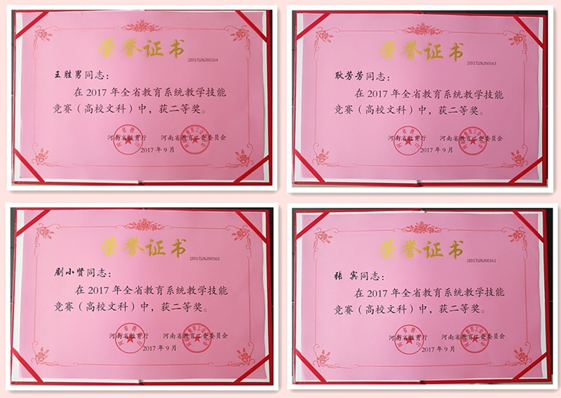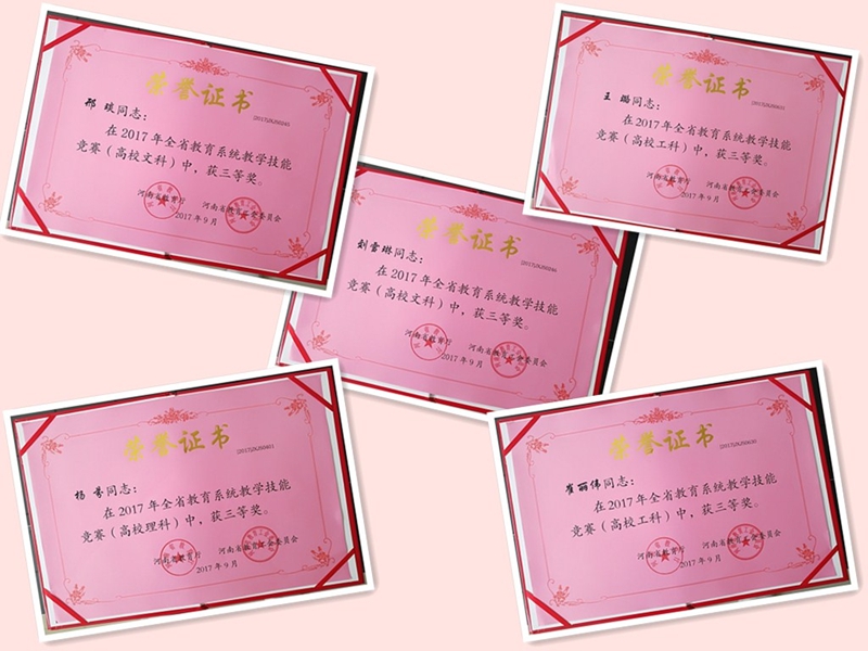 日前,从省教育厅、省教育工会联合下发的《关于表彰2017年度全省教学技能竞赛获奖个人的决定》(豫教工〔2017〕17号)中获悉,我校教师凭借扎实的专业功底、娴熟的教学技能和良好的教学效果,取得了3个一等奖、4个二等奖、5个三等奖的优异成绩,展示了良好的师风和教风,为学校赢得了荣誉。